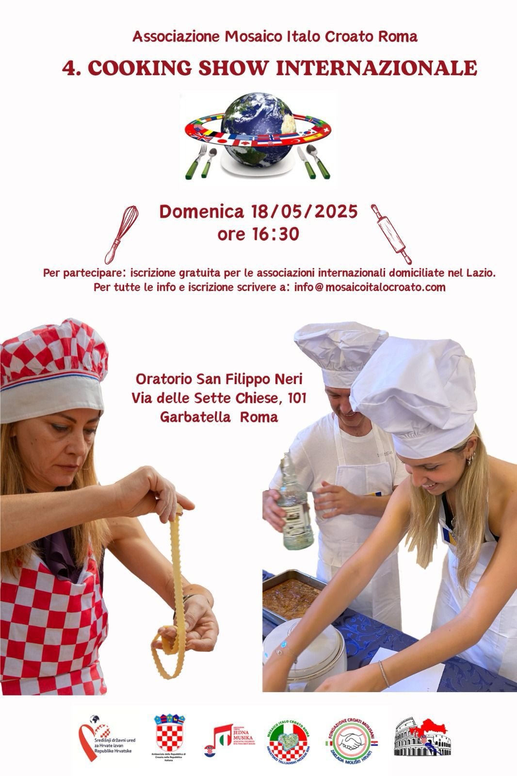 U organizaciji Udruge Hrvatsko-talijanski Mozaik Rim i u suradnji s Udrugom Jedna musika iz Kruča (Molise, Italija), u subotu 18. svibnja 2025. godine održan je četvrti međunarodni “Cooking Show” – jedinstveni gastronomski događaj koji je dio već dobro poznatog projekta “Hrvatski susreti u Rimu”.