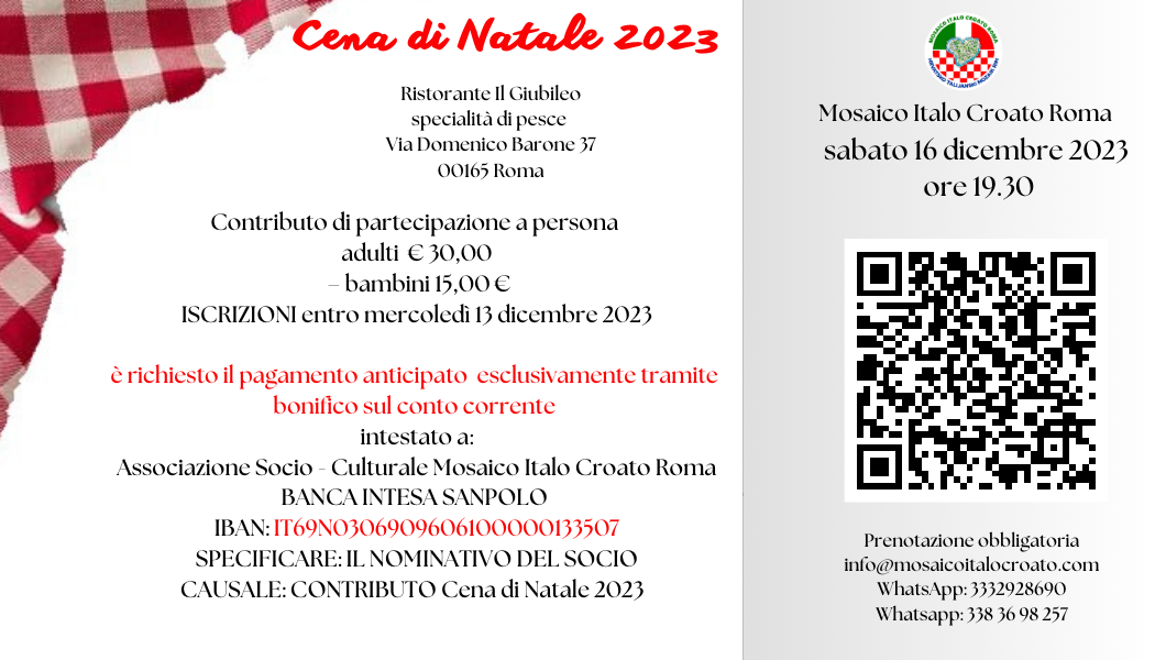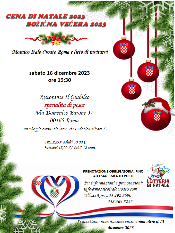 Onome čemu se posebno veselimo svake godine je naša zajedničko predbožićno druženje. Svečana večera je organizirana od upravnog odbora Udruge Hrvatsko Talijanski Mozaik Rim 16. prosinca 2023. u restoranu “ Il Gubileo” koji je bio bogato okićen za nastupajuće blagdane.