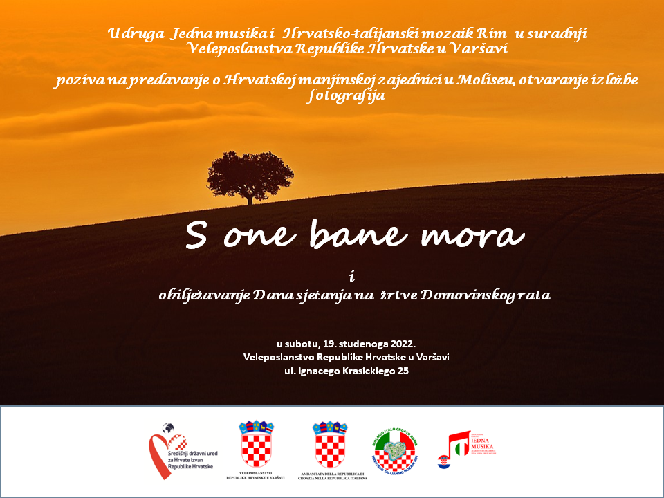 10. prosinca 2022.Udruga Jedna musika u suradnji udruge Hrvatsko-talijanski Mozaik Rim započele su projekt pod nazivom “Kako je lipo hoditi“. U sklopu projekta u subotu 19. studenoga u Veleposlanstvu Republike Hrvatske u Varšavi veleposlanik Tomislav Vidoševići otvorio je Izložbu o moliškim Hrvatima “S one bane mora”. Naglasio je značaj očuvanja identiteta, običaja i jezika kojim se još uvijek nakon 5 stoljeća služi jedinstvena hrvatska zajednica u regiji Molise, te iznimnu važnost potpore koju toj zajednici pruža u prvom redu Središnji državni ured za Hrvate izvan Republike Hrvatske.