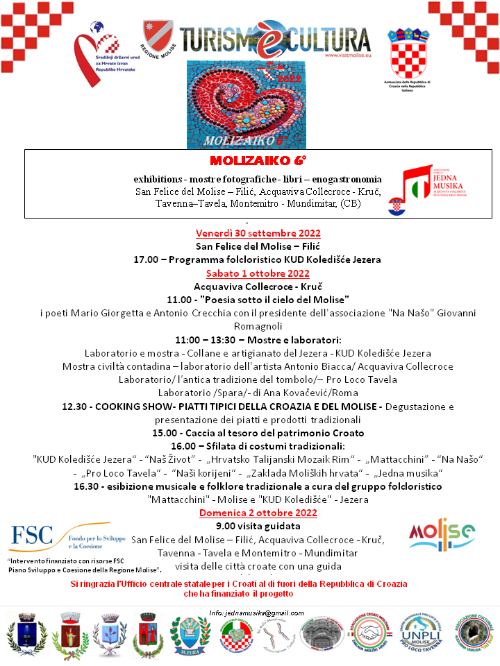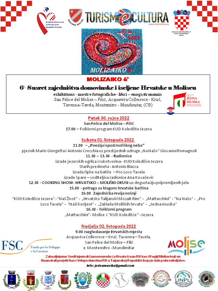 Ovogodišnji susret domovinske i iseljene Hrvatske Molizaiko 6. započeo je je u petak, 30/09/2022 u San Felicie dell Molise/Filić . Ovogodišnji gosti iz Hrvatske bili su KUD Koledište iz Jezera koji su uz Ples, muziku i pjevanje pokazali bogatstvo hrvatskog folklora.