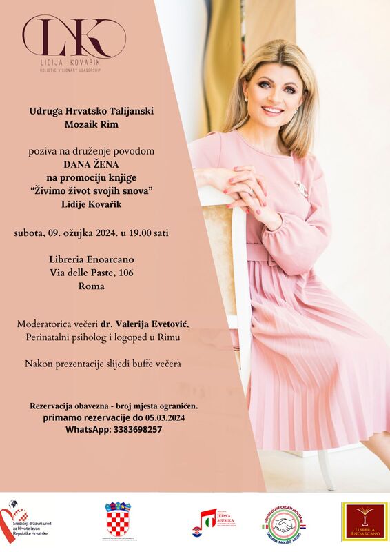 Voditeljica večeri bila dr. Valerija Evetović, perinatalni psiholog i logoped u Rimu i vojvođanska Hrvatica. Hrvatsku žensku zajednicu u Rimu provela je kroz sedam poglavlja knjige. U svakom poglavlju autorica čitatelja dovodi do promišljanja i koraka koji vode prema životu iz snova, a poziva ga i na zapisivanje svojih misli, želja, pisanje dnevnika emocija…kako unaprijediti i kako biti najbolja verzija sebe.