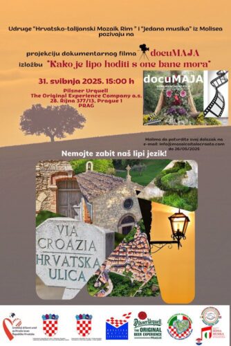 Rim – Prag/ U suradnji dviju iznimno aktivnih udruga Hrvatsko-talijanski Mozaik Rim i Jedna musika iz Molisea u subotu 31. svibnja u prostorijama Pilsner Urquell The Original Experience Company a.s. u srcu Praga prikazan je dokumentarni film „docuMAJA i izložba “S one bane mora” o moliškim Hrvatima.