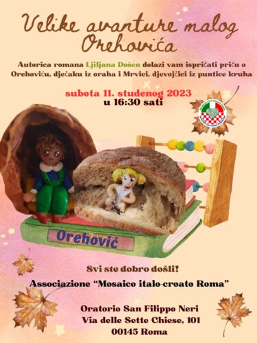 Associazione “Mosaico italo-croato Roma”poziva u subotu 04. studenog u 16:30 na predstavljanje romana “Velike avanture malog Orehovića”.