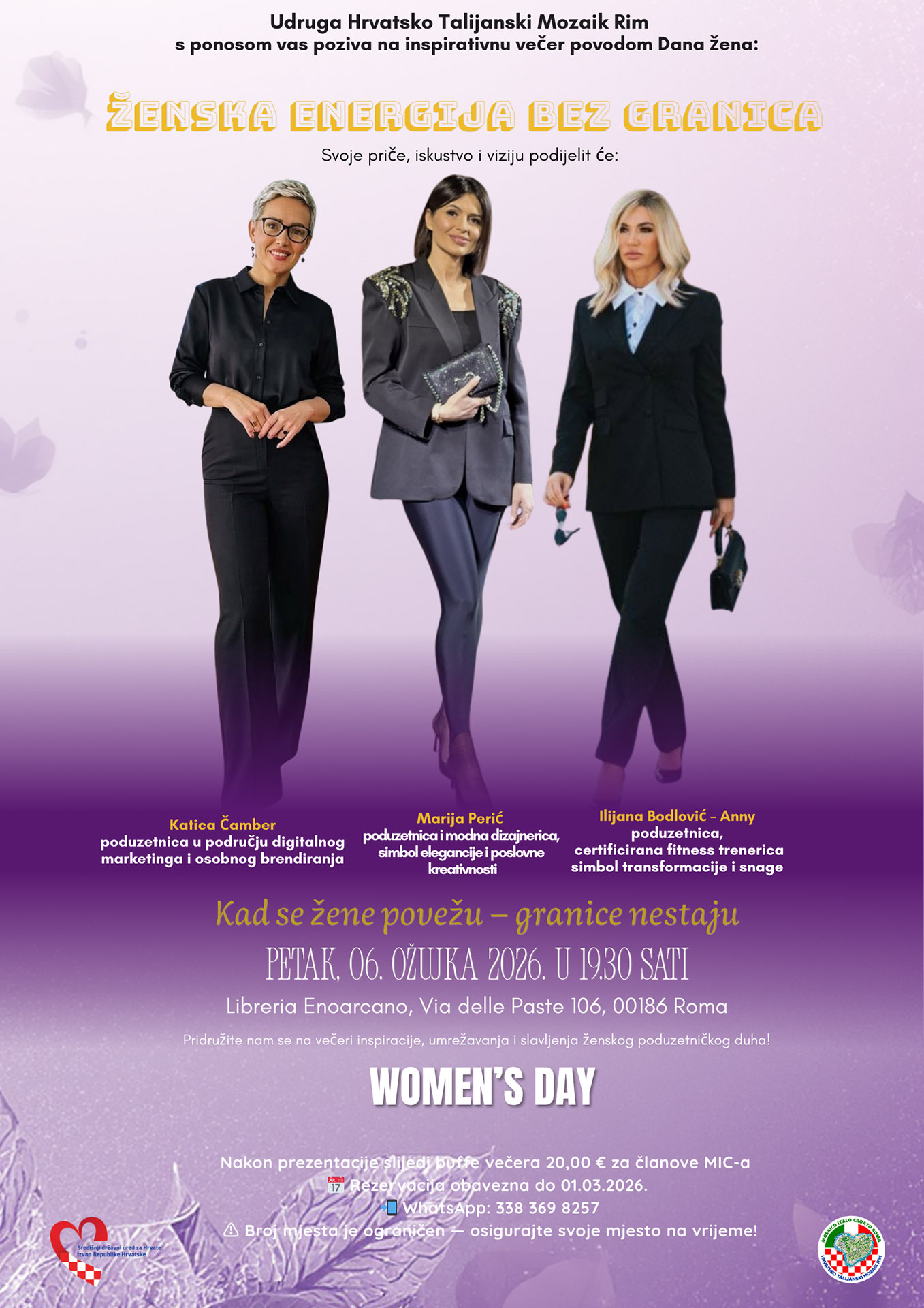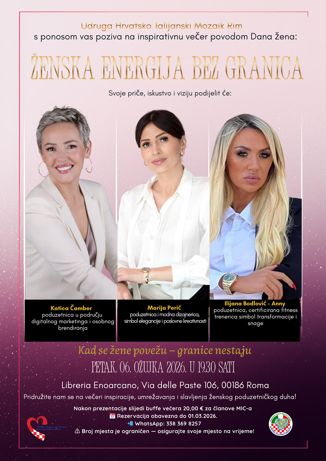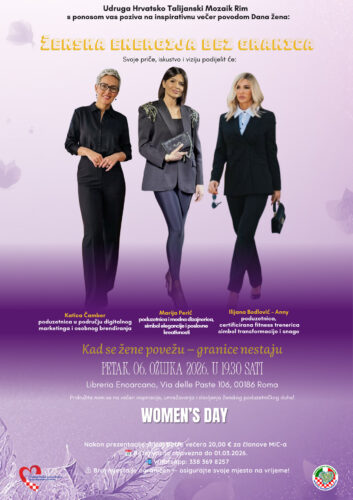 21. veljače 2026.Redovito godišnje obilježavanje Dana žena društveno-kulturne udruge Hrvatsko-talijanski mozaik iz Rima ove je godine doživio svoje jubilarno deseto izdanje. Naime, ovaj projekt rimskog Mozaika ispisuje najljepše stranice o životnim putevima i uspjehu Hrvatica u iseljeništvu. Ovogodišnja večer bila je posvećena ženskom poduzetništvu, kreativnosti i međusobnom osnaživanju, a i jednom istinskom ženskom prijateljstvu. Okupio je brojne članice na već kultnoj adresi, u via delle Paste, u lokalu "L’Arcano", a vlasnica lokala, Tatjana Pavelić, koja već desetljeće ugošćuje rimsku hrvatsku žensku zajednicu, stvorila je i ovoga puta toplu atmosferu u izrazito elegantnom ambijentu. Da je ovaj događaj postao nezaobilazna točka na kalendaru rimskih Hrvatica, dokazuje i činjenica da je Sold Out bio proglašen čak mjesec dana unaprijed.